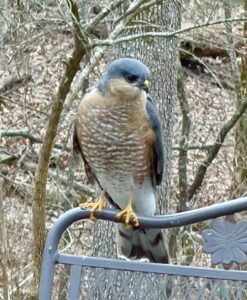 Yesterday, for the first time, this guy showed up. A Sharp-shinned Hawk (Accipiter striatus). Identification rests on several anatomical markers that distinguish it from its near-twin, the Cooper’s Hawk: